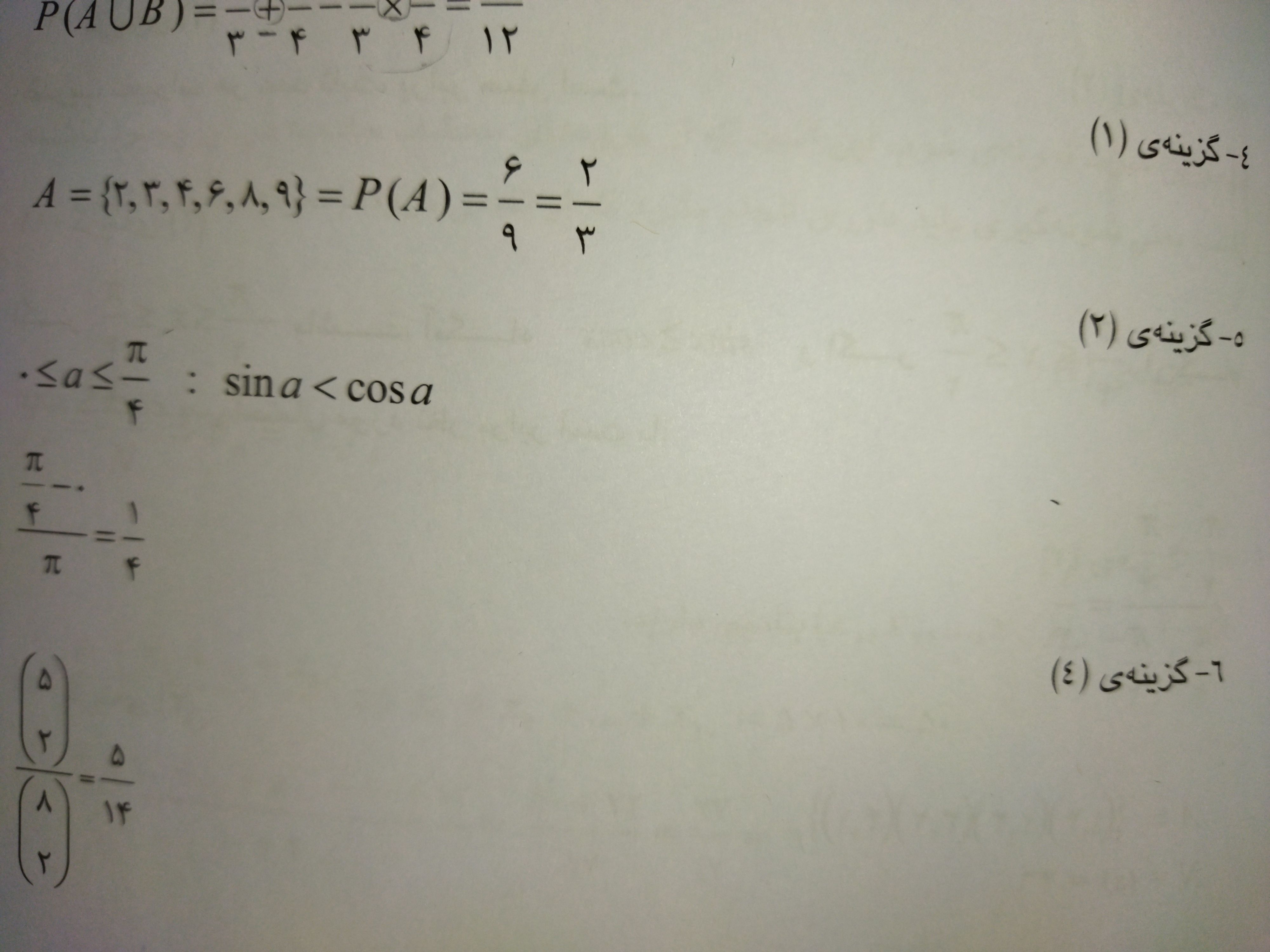 @mk-mahdi سلام . تا پی چهارم کسینوس از سینوس بزرگ تره . میتونی عدد بدی بهش تا پی چهارم که برابر میشن هر دو و میشن رادیکال دو دوم . خب حالا احتمال میشه : مطلوب ÷ کل => مطلوب که همون صفر تا پی چهارم هست و کل هم همون صفر تا پی هست . حالا انتهای بازه رو منهای ابتدای بازه میکنیم . یعنی : پی چهارم _صفر = پی چهارم پی _ صفر = پی حالا پی چهارم ÷ پی =یک چهارم