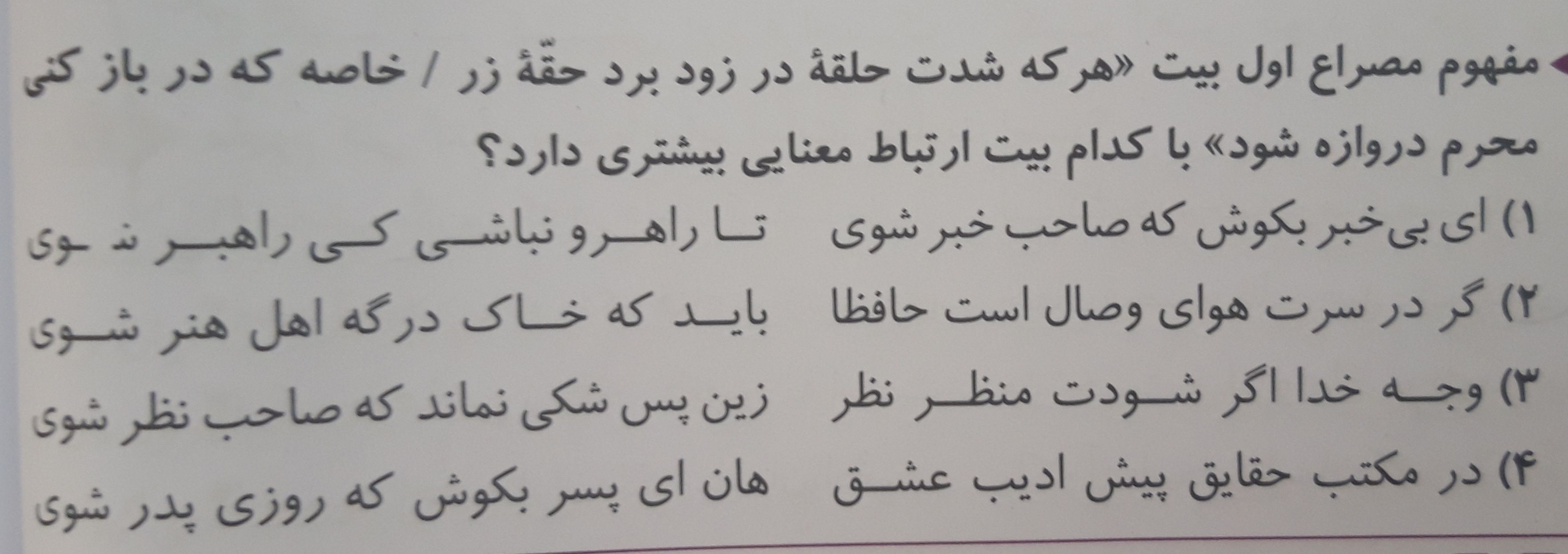 Sara_R سلام دومی درموردعشق هست که گزینه دوبهش میخوره میگه اگرمیخوای به معشوقت برسی هوای عشق وعاشقی به سرت زده باید به خداتوکل کنی وتلاش کنی وراه ورسم عاشق شدنو یادبگیری تاشایسته هنرعشق بشی اینم بیشتردرس ۷دوازدهم ادبیات رشته انسانیه که پسرباپدرش رفتن مکه پسره دستشو به حلقه درمکه اویزون میکنه وداستانش اونه